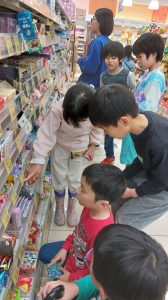 高学年の子とペアになってもらい、消費税があるからこっちの金額を見るんだよ!、レジはここを押して…、としっかり教えてもらいながら、お買い物を楽しみました♪